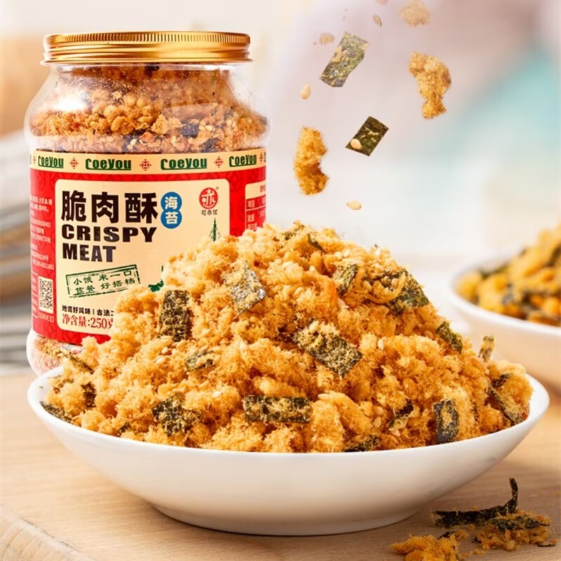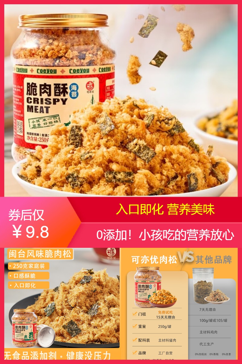 1、【可亦优】❗儿童海苔肉松! 250g#9.8#元 不添加防腐剂色素,香精酱油, 精选原材料,性价比超高, 配粥、烘培都可、有它, 孩子吃饭都能吃一大碗了~~