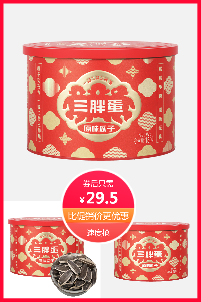 2、(三胖蛋食品旗舰店)【天猫U先】三胖蛋食品店原味瓜子180g红罐装零食炒货休闲葵花籽