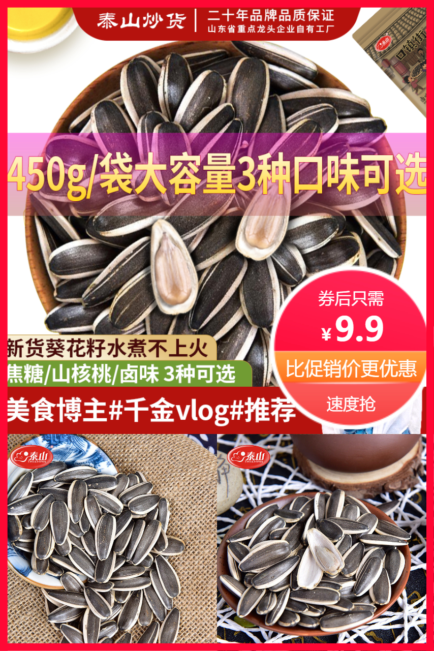 3、【泰山】【新日期】人工层层精心挑选,瓜子大小均匀,颗颗饱满无坏籽,皮薄个大,口感酥脆好吃不腻,多种口味咸甜适中,唇齿留香;蒸煮入味,不含防腐剂,健康无忧,吃完手指不粘瓜子屑,无黏腻感,巨干净~