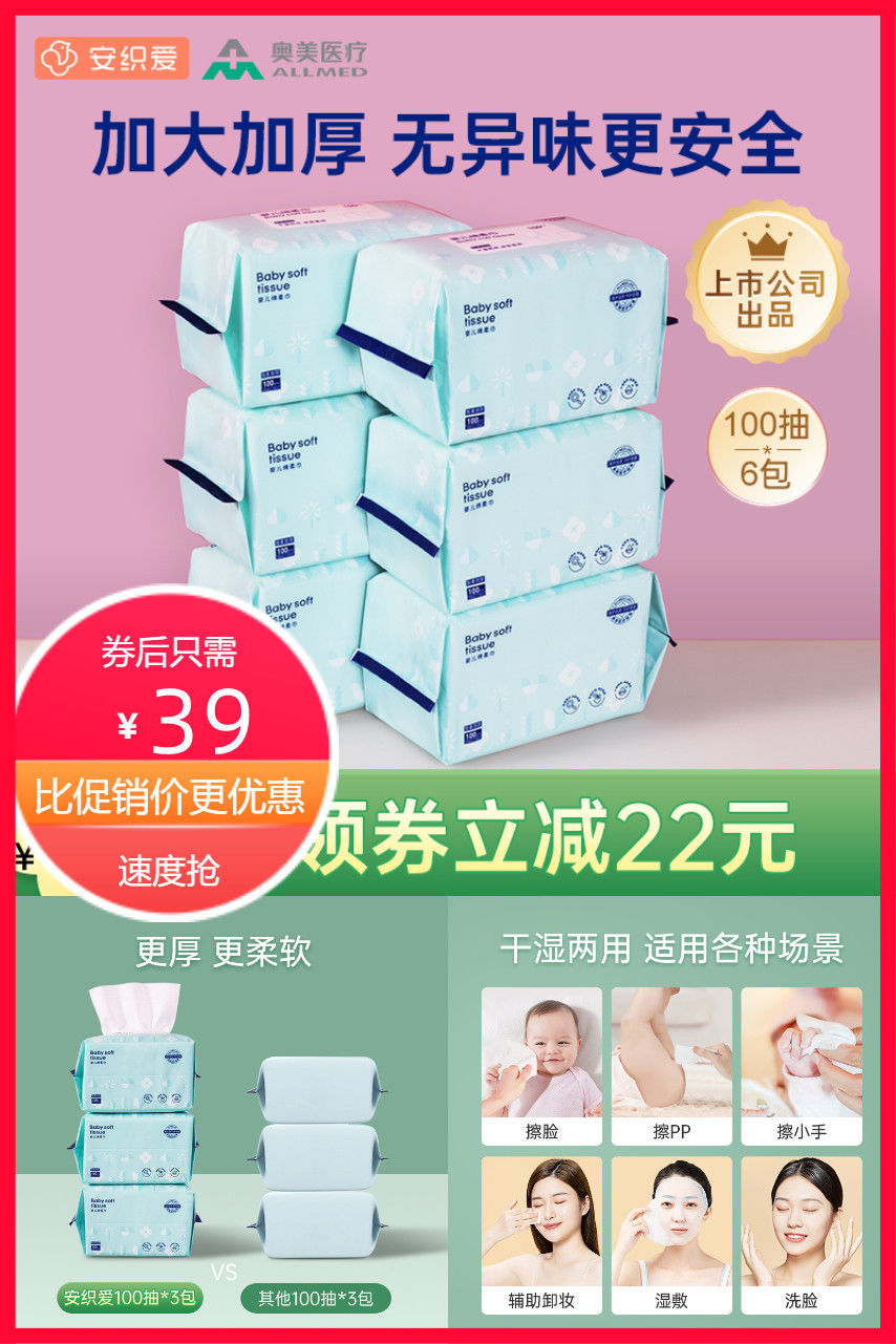2、(安织爱旗舰店)安织爱婴儿棉柔巾家庭装新生儿宝宝手口屁专用纸巾非湿巾100抽6包