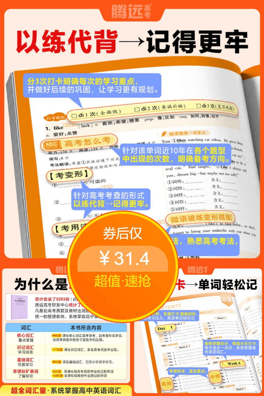 3、腾远高考2026高中英语词汇3500单词英语词典大全,记背神器,效率飞升。高中三载,助你速成高分词汇。高考利器,学霸首.选,高词汇量记得牢!必背素.材,轻松作文提分宝!
