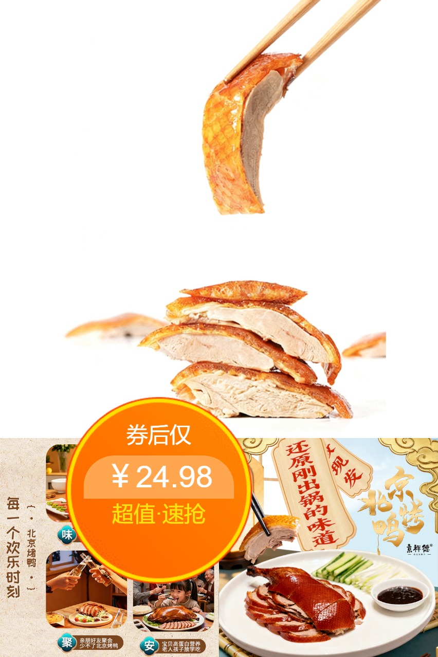 3、领券2次在拍,仅需24.98元!到手2整只北京烤鸭(每只600g,共1200g)+2袋200g烤鸭酱(共400g)!现做现发,新鲜直达!含运费险,破损、异味包赔包退,售后无忧!