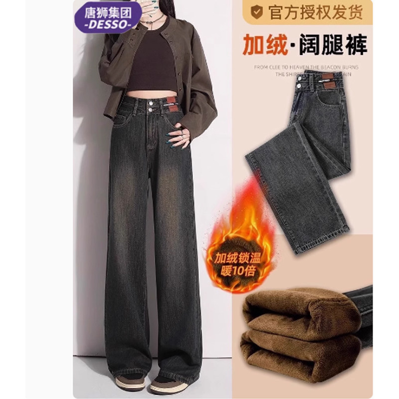 唐狮集团DESSO加绒加厚阔腿牛仔裤女秋冬新品高腰宽松复古直筒裤
