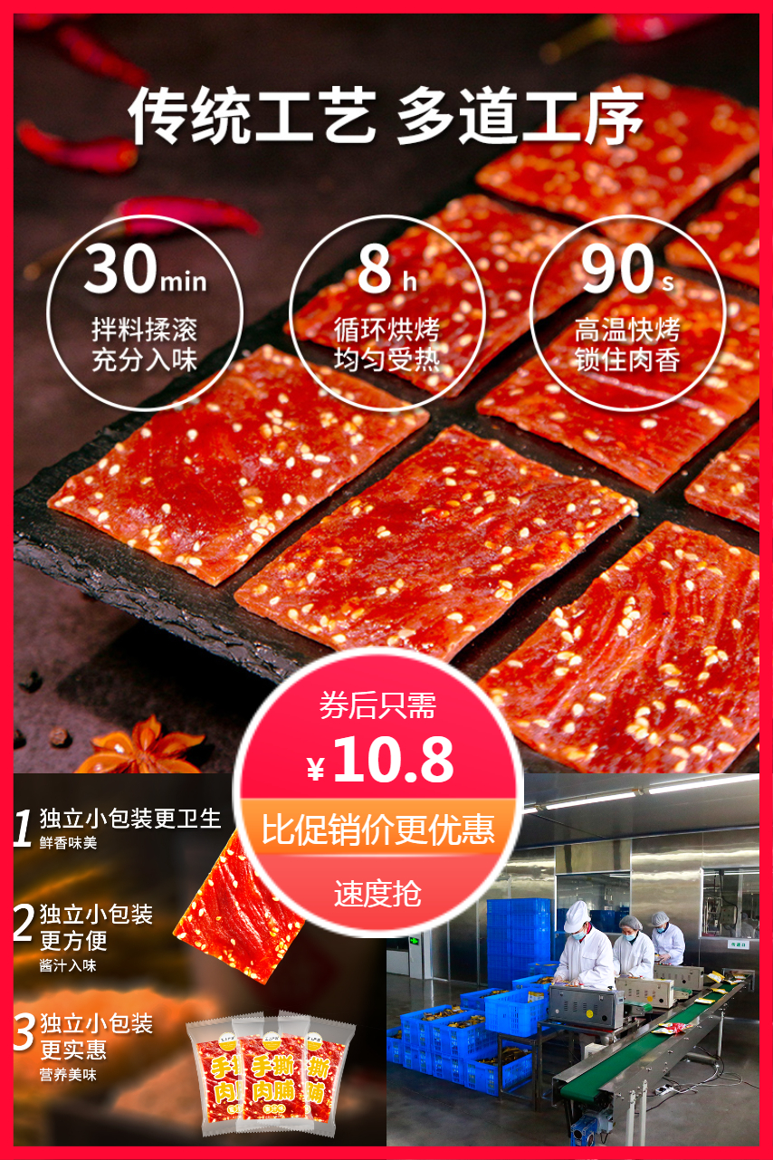 1、休闲零食靖江猪肉脯 券后仅需10.8 传统工艺多道工序 独立小包装更卫生 速速抢购吧