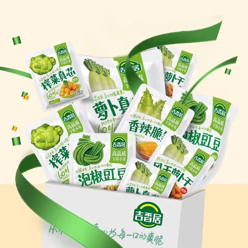 1、【吉香居】减盐休闲零食多口味 20袋装仅17.9 自有种植基地原料, 减盐工艺鲜味突出, 嫩芯就像现拌!