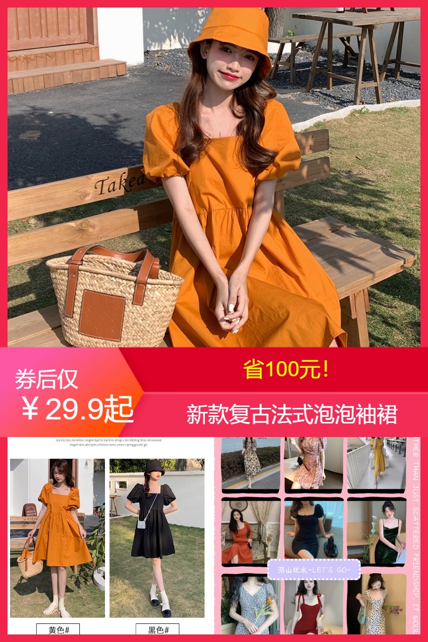 2、(乐薇outlets店)特惠秒杀】2023夏装新款复古法式方领泡泡袖开叉连衣裙桔色碎花裙