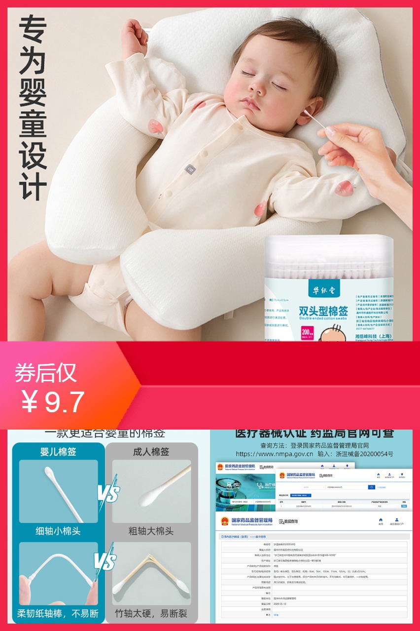 1、宝宝专用双头棉签 9.7元得600支 医用级无菌认证,更安全 一端细软清洁耳鼻,一端圆润擦拭面部 外出居家两相宜,独立包装超方便