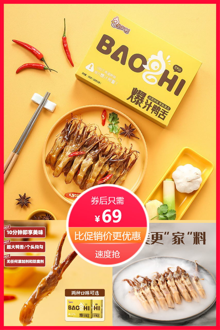3、舌尖上的美味,难以抵挡的诱惑,诱惑你的胃,越嚼越有味!烤箱180度高温烤制,前方爆汁预警!够肥美才够嚼劲,鸭舌必须选大滴!外皮紧致肉质滑嫩,就是这么Q弹!
