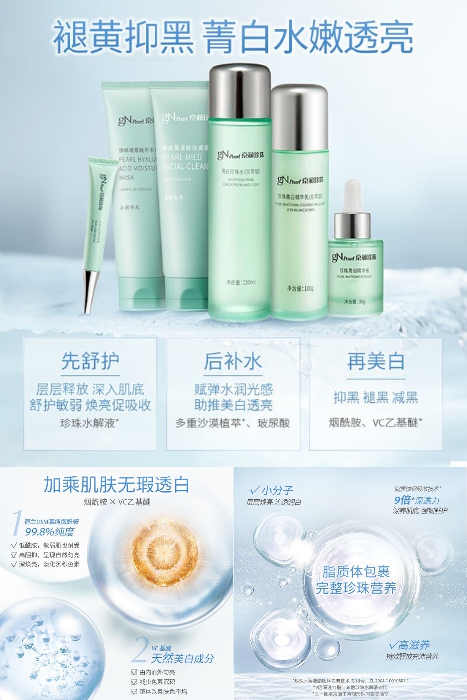 3、惊爆!仅49.9元!把京润珍珠专柜美白套装搬回家!六件套承包你的水光肌;菁白洁面乳-洗出透亮! 菁白爽肤水-深层补水;菁白乳液-锁水润泽;菁白面霜-密集修护;菁白精华-根源抑黑;菁白眼霜-击退暗沉 ;一杯奶茶钱=一套珍珠美白方案! 告别暗黄、干燥、肤色不均!京润珍珠,国货大牌,口碑保证! 天然珍珠菁萃,温和美白不刺激,补水保湿一步到位!