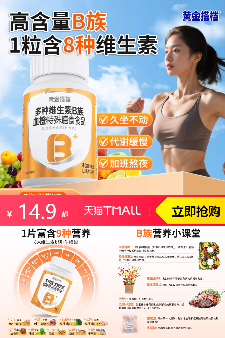 1、工作繁忙需提神,快来入手‘黄金搭档’!” 多重B族守护您健康。 每粒维生素含b1b2b3b6b12等成分。 适合熬夜应酬的男女通用! 把握健康生活新起点!
