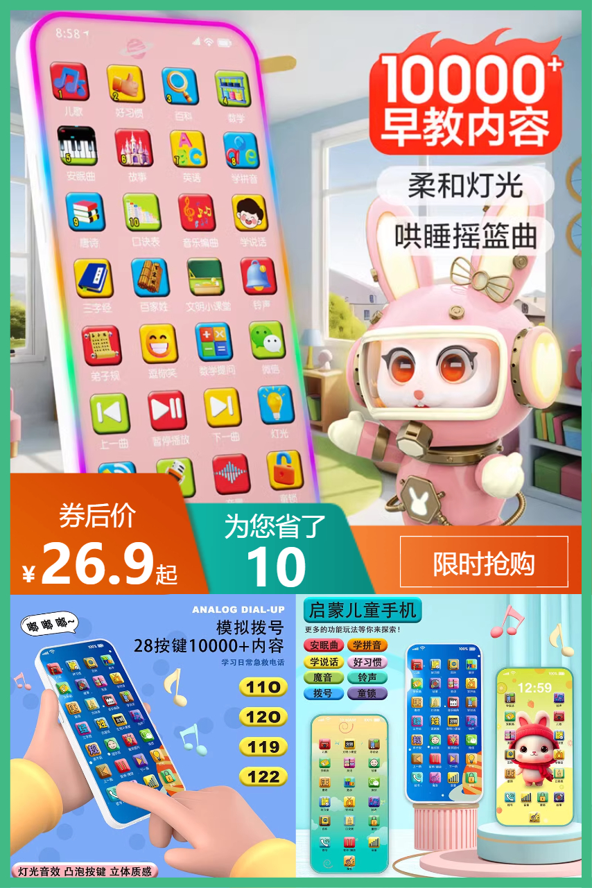 3、启蒙儿童手机,10000+早教内容,安眠曲学拼音,模拟拨号,智能灯光,宝宝玩乐从这一刻开始~