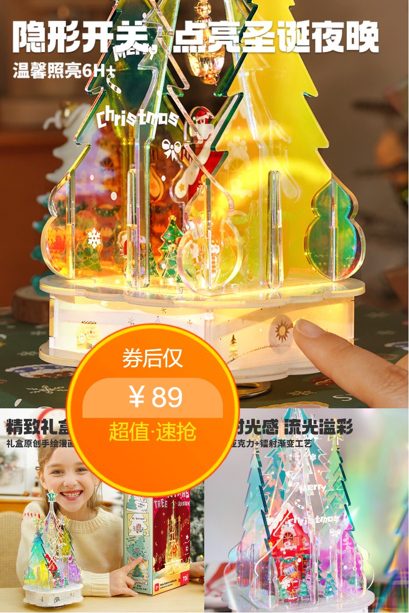 1、【图益】圣诞树八音盒diy手工材料包 券后仅需89 尜 点亮圣诞夜晚 隐形开关,轻触即亮 柔和暖光,温馨照亮6H+ 双面印刷亚克力,立体拼插造场景 速抢