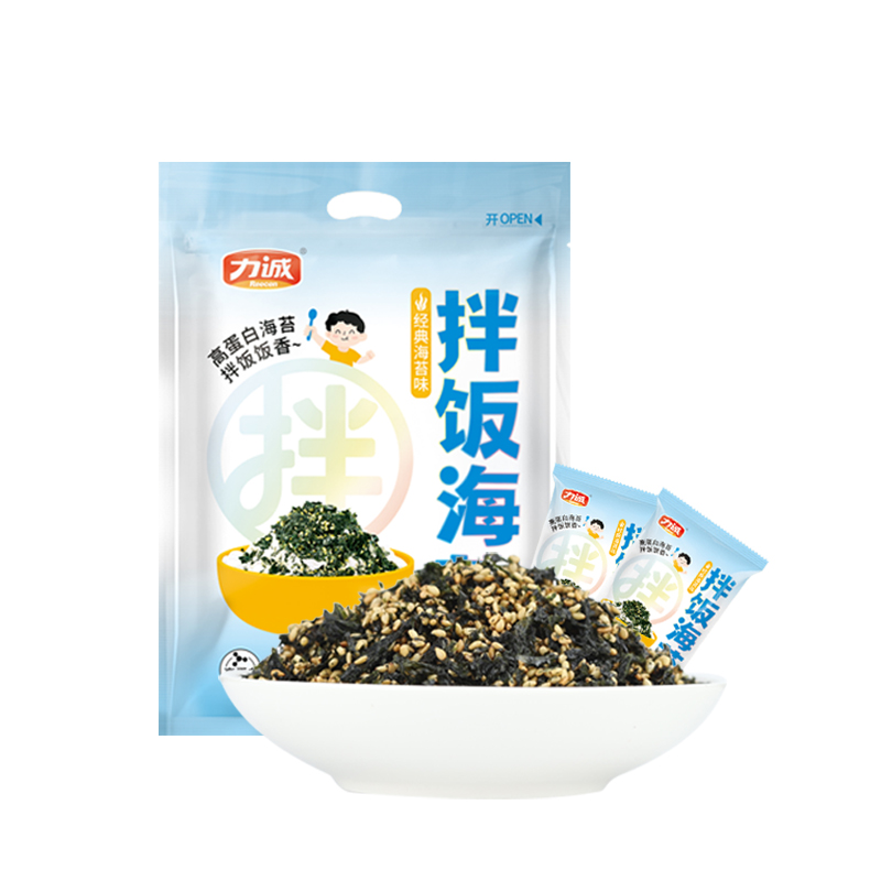 3、【力诚】优质条斑紫菜,金秋十月收割,鲜嫩爽口,新鲜采摘,品尝海洋的味道!添加膳食纤维,唤醒“肠”动力赋予拌饭海苔更高的钙铁锌含量,多重营养科学配方选我们就对了!!
