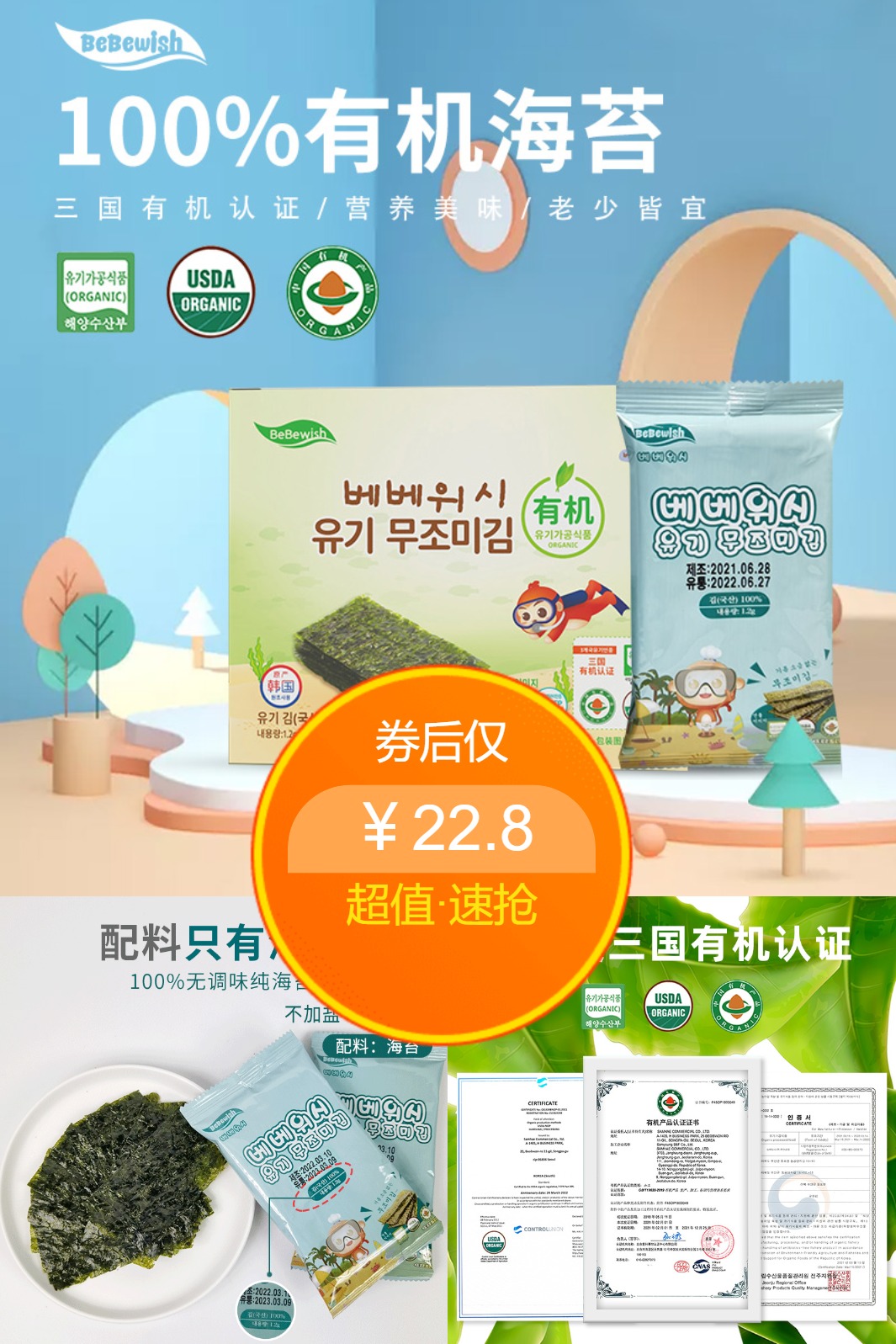 1、韩国宝宝膳愿儿童进口海苔 质地脆嫩,咸香可口 0添加非油炸不上火 孕妇宝宝都可食用