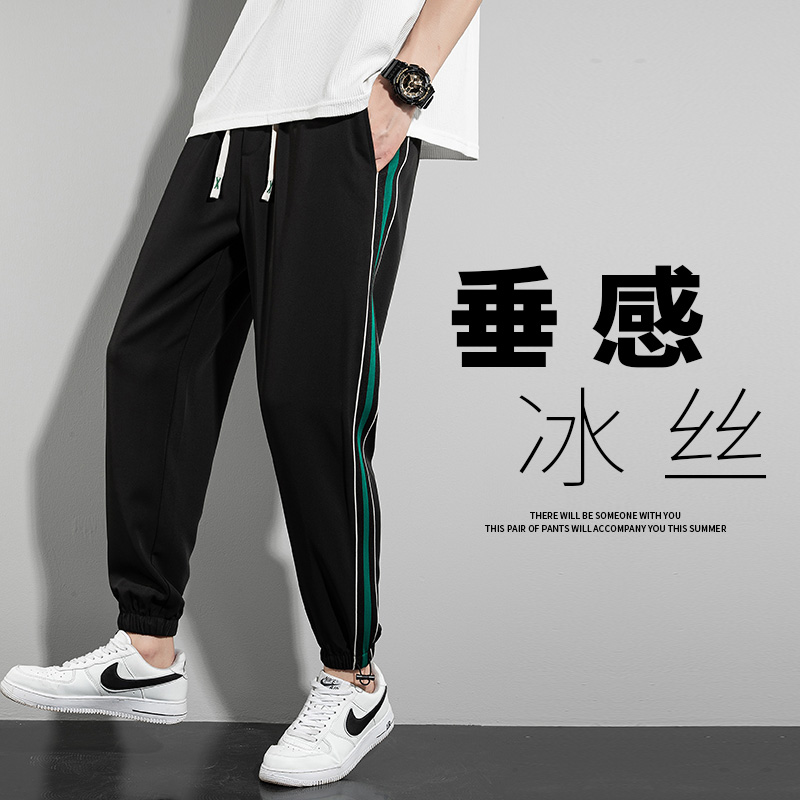 夏季爆款垂感冰丝裤子男薄款透气宽松时尚休闲运动裤条纹速干长裤