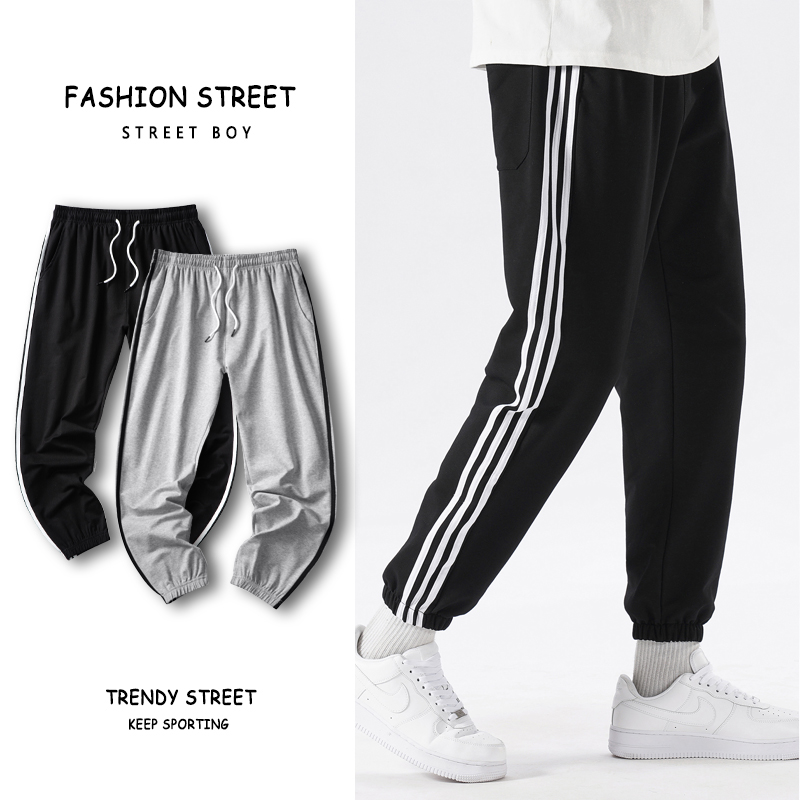 三条杠纯棉小脚跑步卫裤潮流束脚裤薄款春秋季休闲运动长裤男宽松