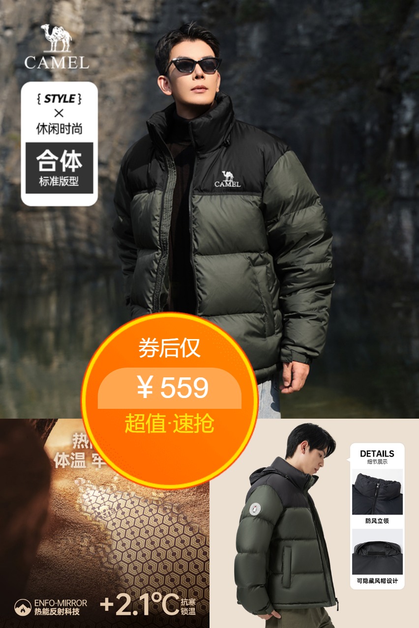 1、冬日必备,骆驼火山羽绒服 保暖性能卓越,温暖你一整个冬季 男款连帽设计,时尚又实用 加厚棉服,温暖无负担,过冬更轻松 ️