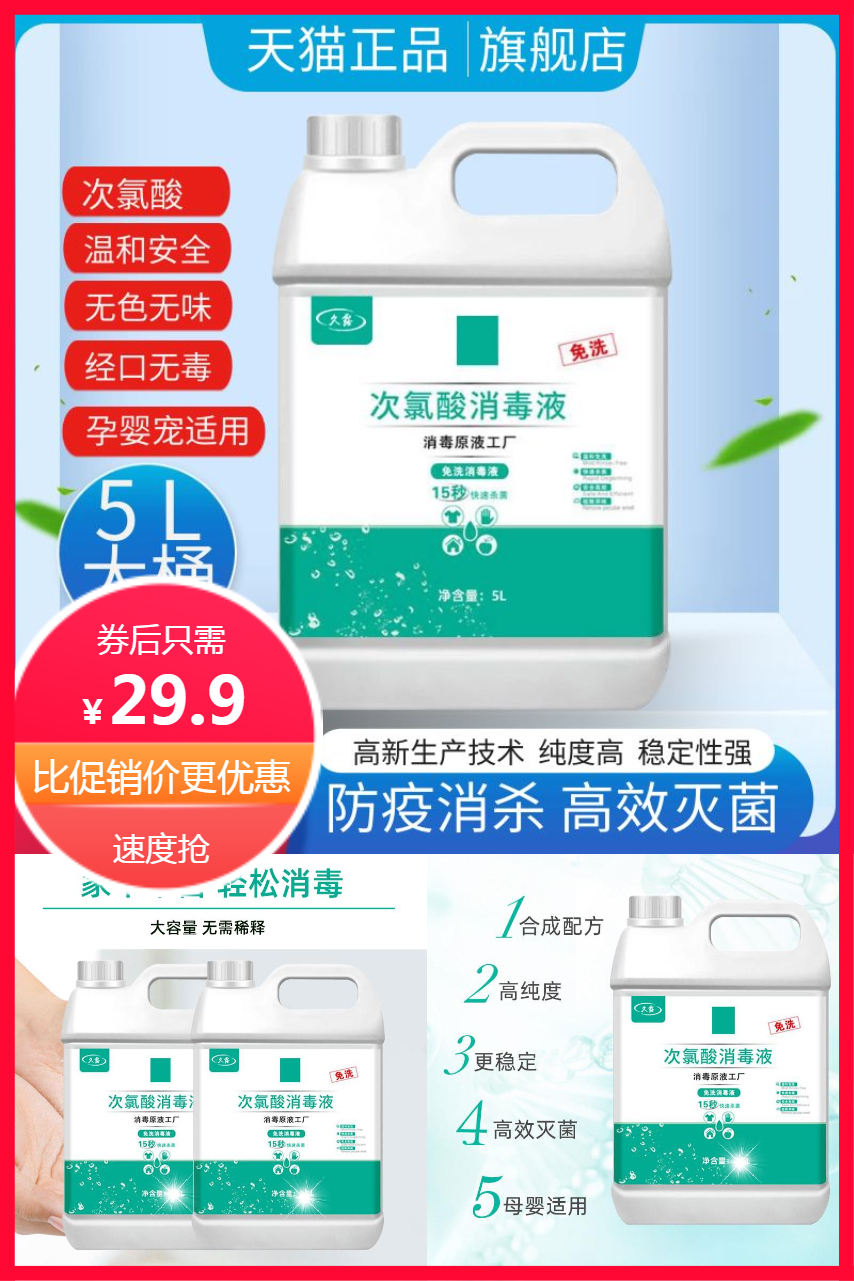 1、5L大桶次氯酸消毒液旗舰店正品 券后仅29.9 温和亲肤 如水般温和无刺激 速速抢购吧
