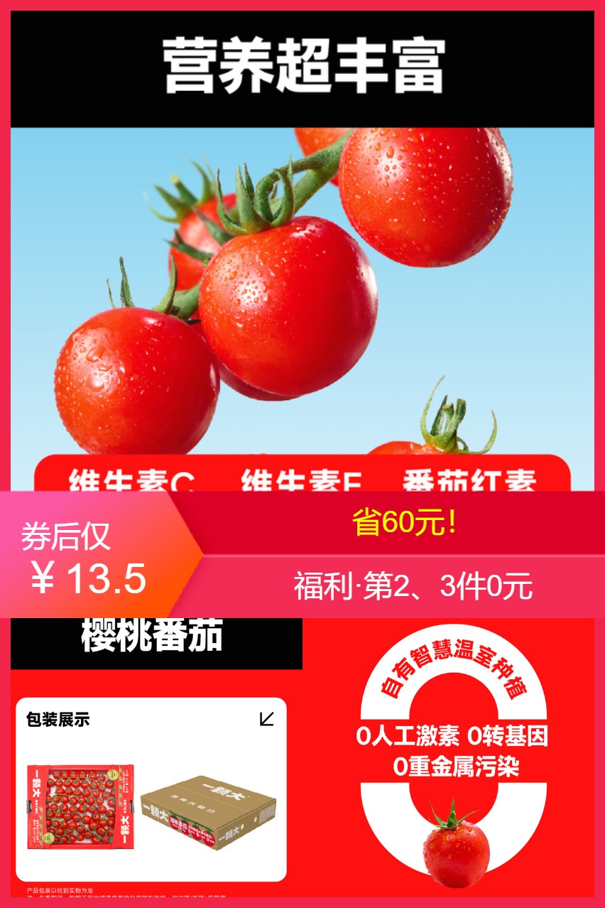 3、应季新鲜采摘,1kg足量盒装,果实饱满无挤压,不管是直接当水果生吃、拌沙拉,还是搭配早餐、做减脂餐配菜都超合适!现在下拉详情页领券,到手仅33元,家庭日常分享、办公室加餐都划算,新鲜直达不等待,爱吃小番茄的别错过~