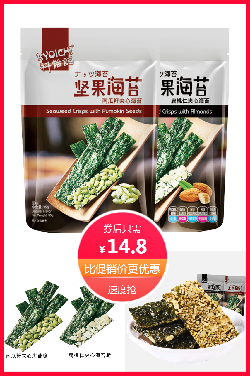1、夹心脆芝麻扁桃仁海苔 券后价14.8 鲜香酥脆,美味夹心 速来抢购吧