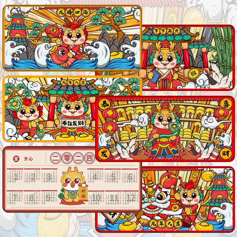 2024龙年国潮鼠标垫超大号创意日历电脑桌垫新年红色发财办公桌垫