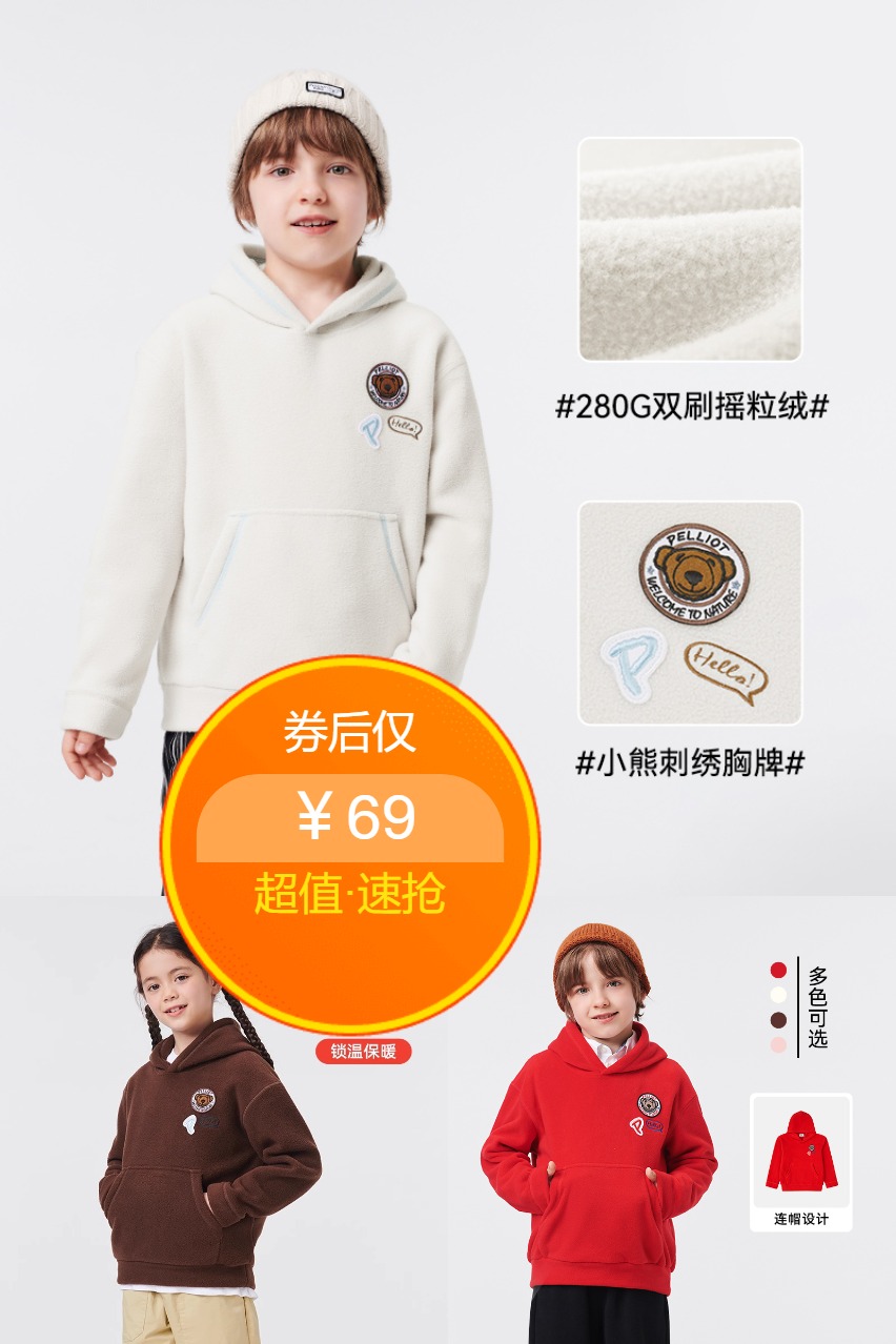 3、清仓!伯希和户外保暖男女童摇粒绒休闲连帽卫衣,男女童同款外套,温暖保驾。连帽休闲风来袭,舒适透气,抓绒温暖,连帽设计真酷炫