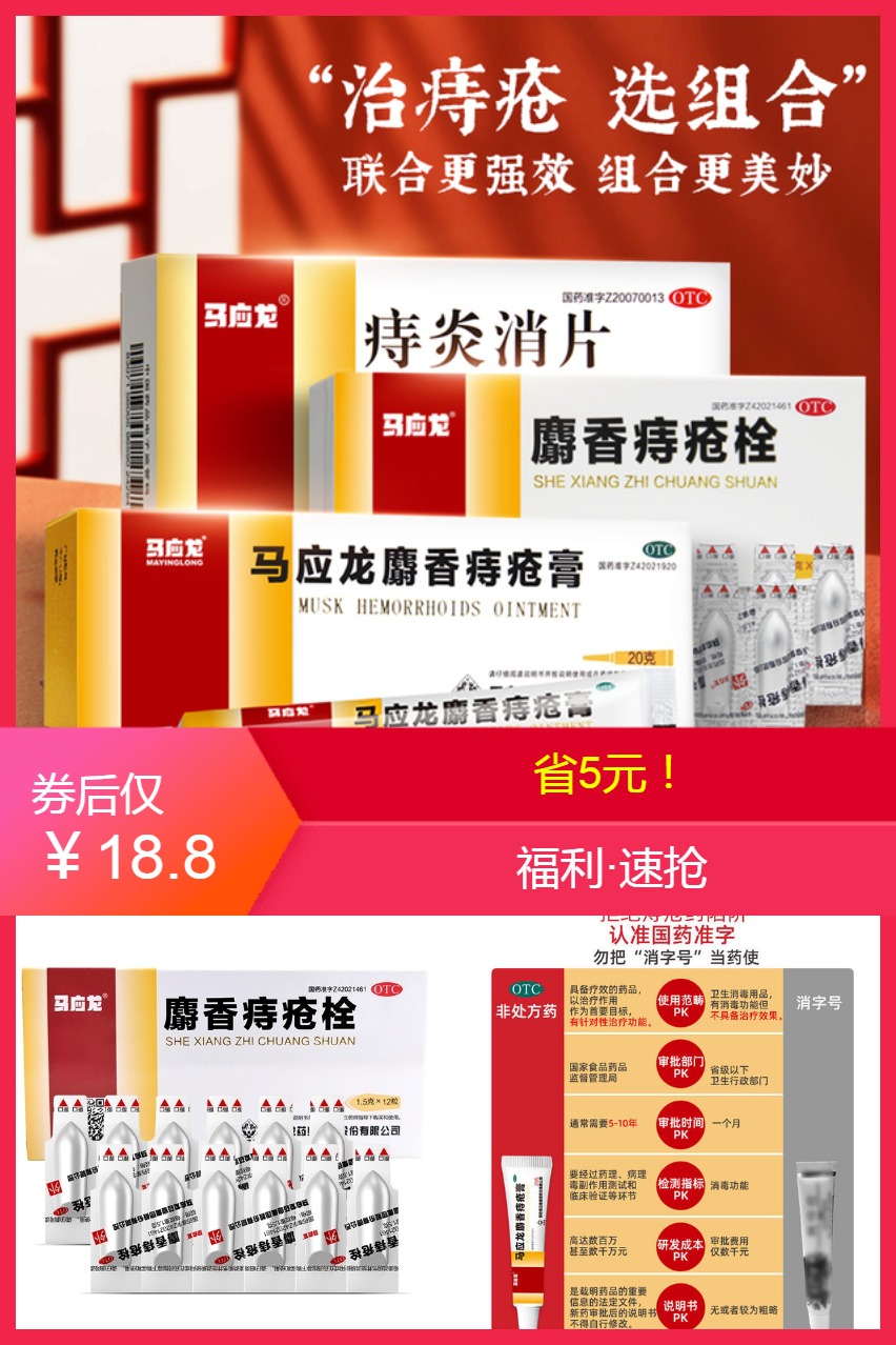 1、马应龙痔疮栓 补贴价18.8元,送84片湿巾 四百年品牌,值得信赖 快速缓解疼痛不适,适用多种症状 内外混合痔、便血、肛裂,一网打尽