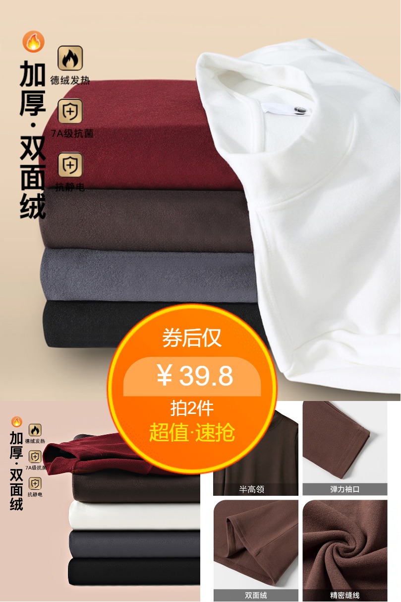 1、【拍两件】半高领高级感双面德绒打底衫 券后仅需39.8 德绒黑科技双面磨毛 婴儿肌肤般柔软亲肤 不易卷边 贴合肌肤 速抢