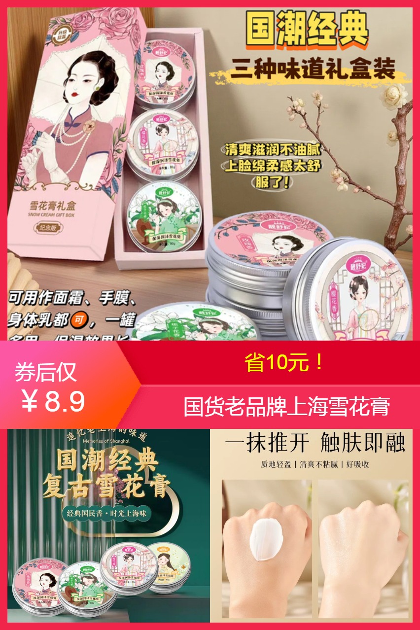 1、妈妈辈用的雪花膏!性价比直接拉满! 靓舒妃旗舰店•雪花膏3罐礼盒装 8.9亓,折2.9亓/罐 质地是那种软乎乎的冰激凌感,保湿效果长达24H 当面霜/手膜/身体乳都可以,咋用都不心疼!