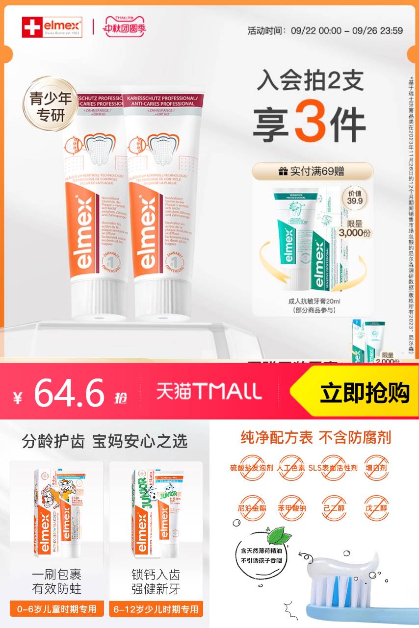 3、【选儿童牙膏拍2件,用券叠加淘金币到手56.56,单支到手仅需28.2】elmex艾美适青少年牙膏,高氟12岁以上正畸期专用,防蛀温和清洁,原装进口
