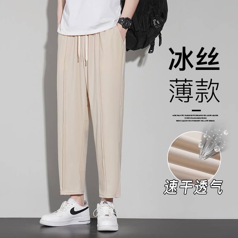 真冰丝经编立体腰冰丝裤男士直筒九分裤夏季休闲小脚裤宽松高弹