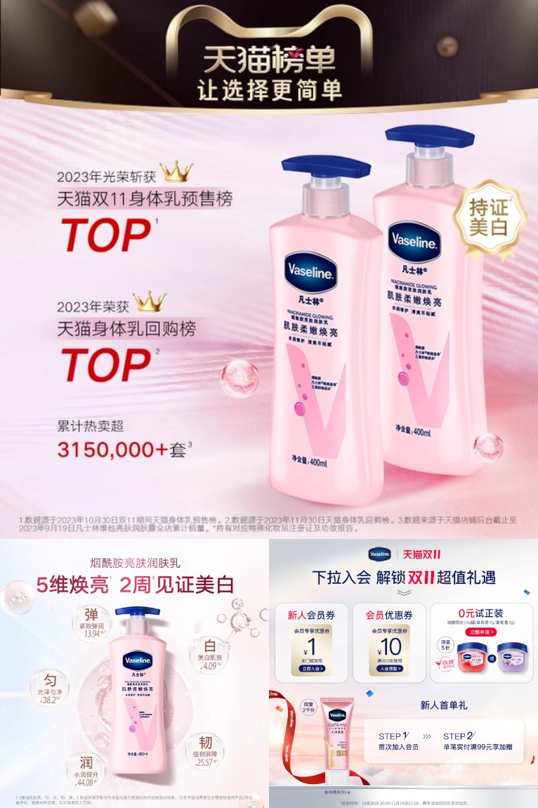 1、凡士林美白身体乳400ml 35.77送30ml身体乳 买400ml+200ml更划算! 50.17送60ml身体乳 烟酰胺修护,14天焕亮肌肤