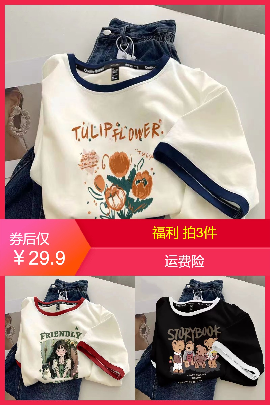 1、单件9.9!但是是19一件的质量!! 款式印花都好看 拍③件,29.9 新款纯棉撞色印花短袖