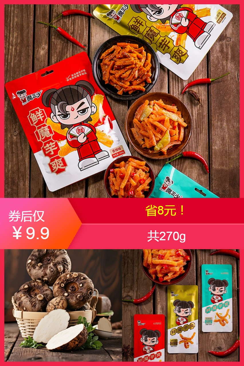 1、【之前一袋4.9元,现在3袋9.9元,折一袋3.3元,速抢】一袋里面5小包, 魔三少鲜魔芋爽,鲜魔芋制作,口感韧滑,融合黔川湘味, 香辣、酸辣、麻酱三种口味任选,开袋即食,脂肪含量低,多吃不怕胖!