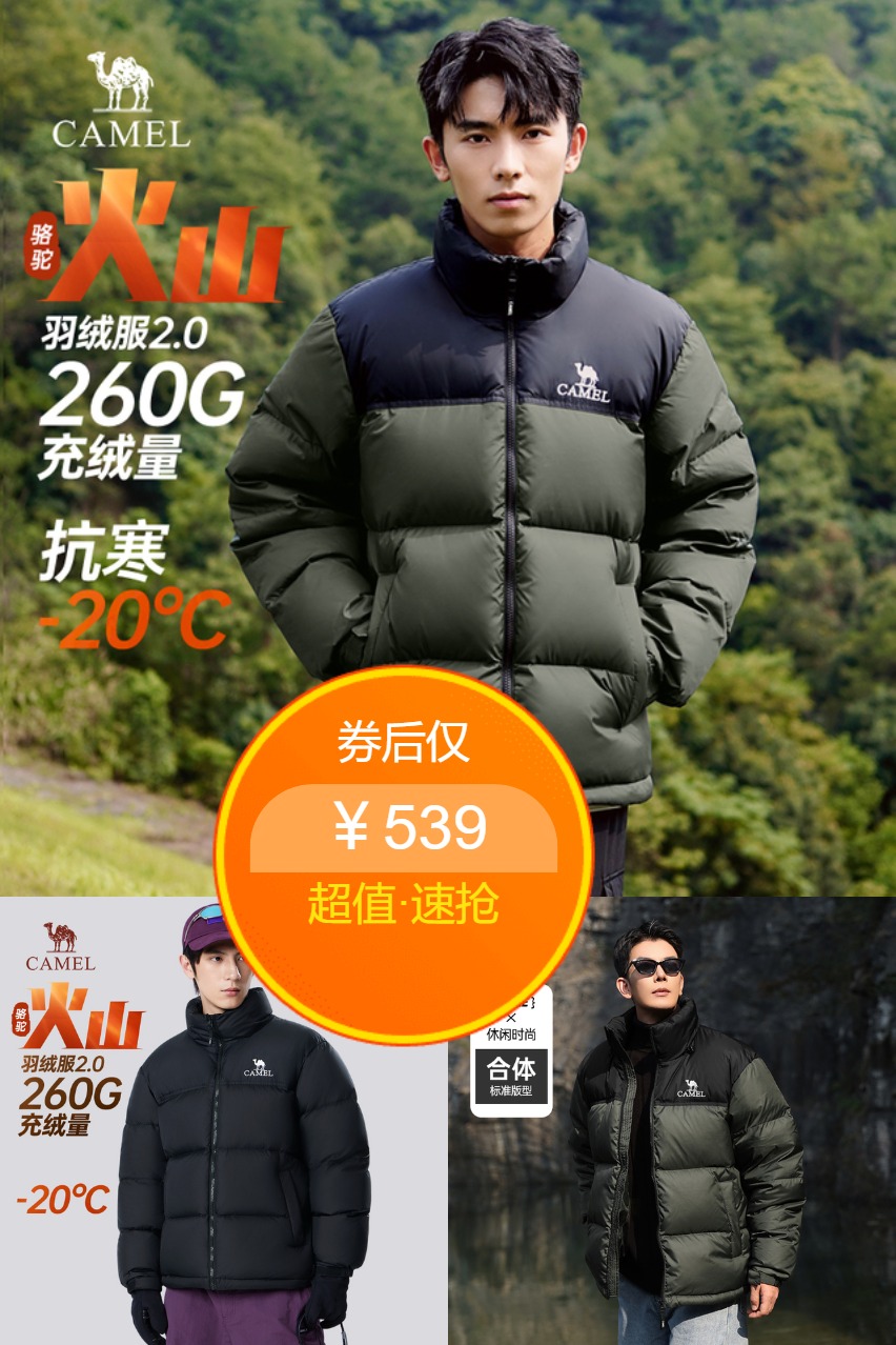 3、骆驼火山羽绒,短款显瘦显高!毛感满满!更佳舒适保暖,必抢哦!羽绒柔软,寒冬也可轻装上阵!充绒量260G,热能内里体温牢牢锁住。
