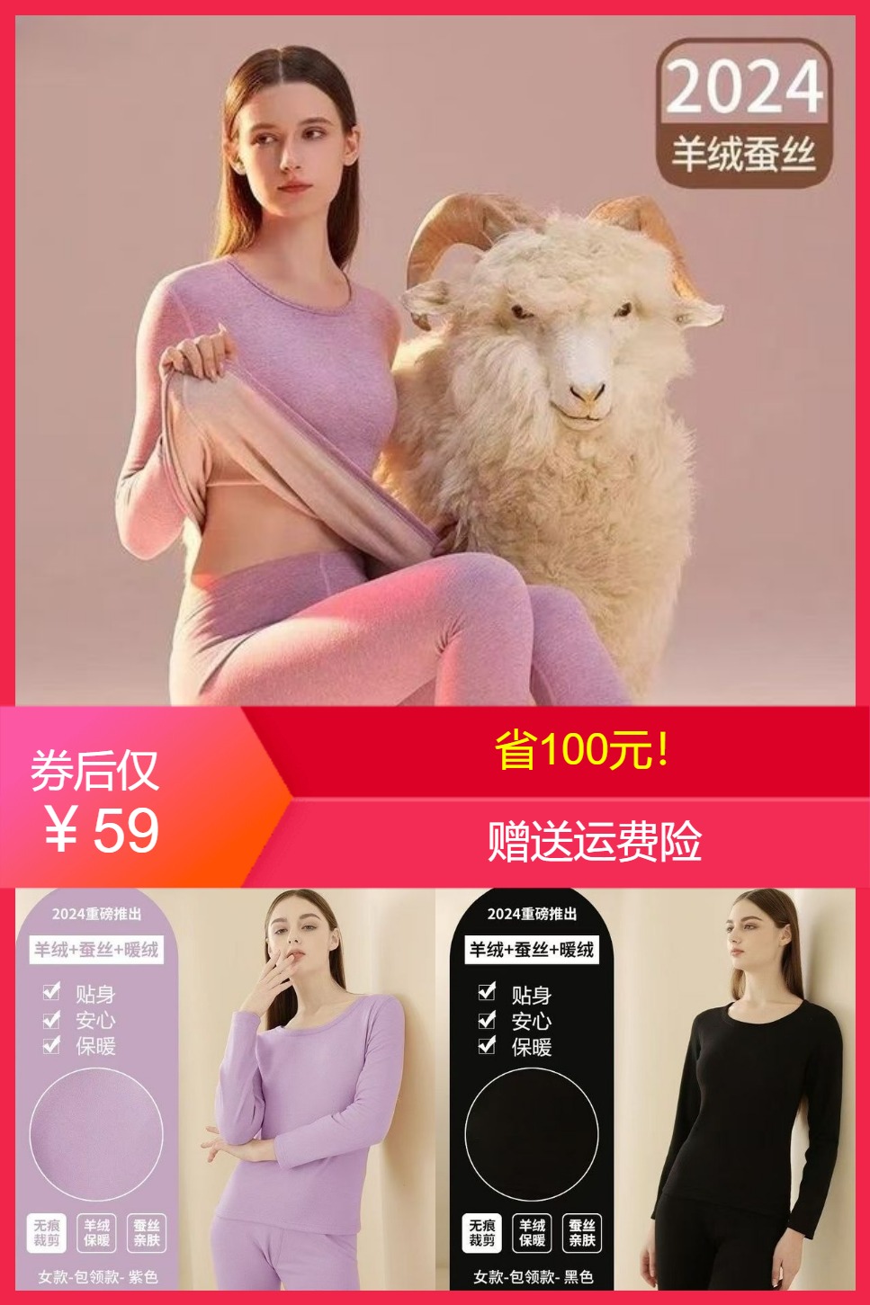 2、(运动无限123)羊绒蚕丝德绒内衣加厚秋裤修身打底秋冬季套装保暖套装女加绒秋衣