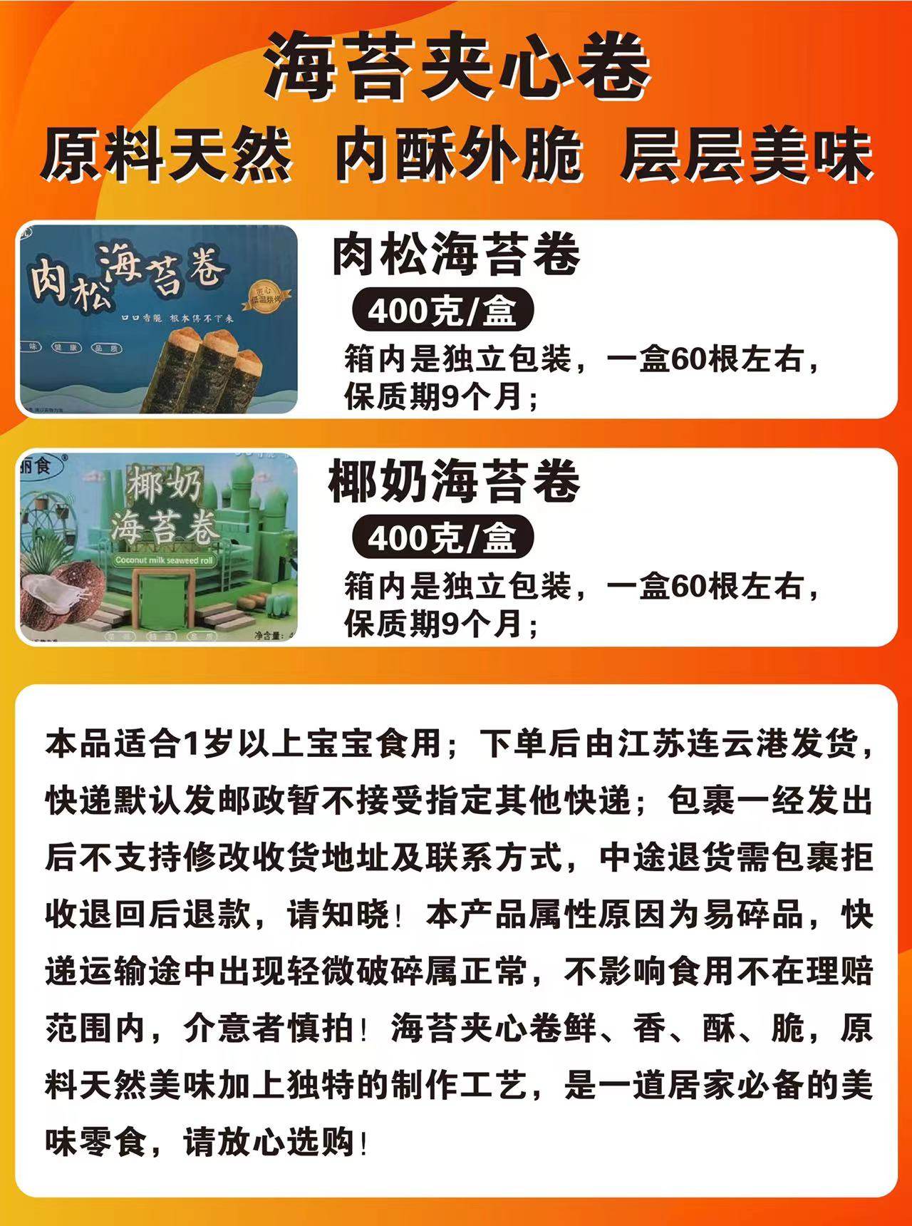 1、【麦丽食】海苔肉松卷盒装400g 鲜香酥脆,一口畅享缤纷美味, 仅16.9元 口口留香,海苔片质地扎实 香浓的肉松,独立包装,食用方便