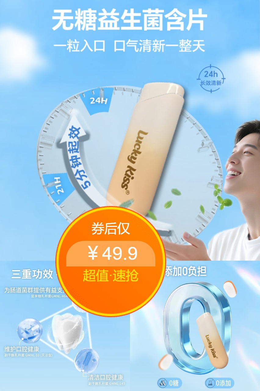 2、(luckykiss旗舰店)luckykiss弹射益生菌含片清新口气口香糖无糖薄荷糖维c网红零食