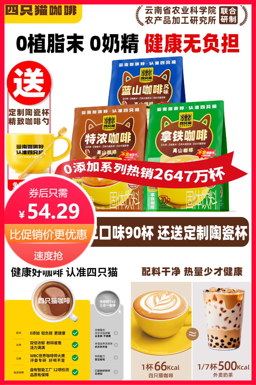 四只猫【90条/110条+杯】拿铁蓝山特浓速溶云南咖啡三合一30条/袋