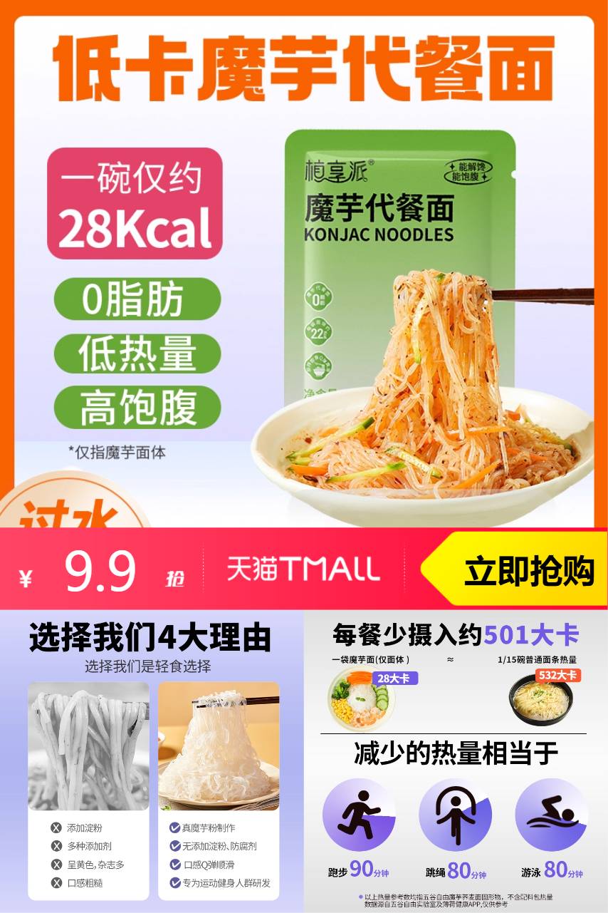 3、【支付宝限时立减5元,到手4.9元】【拍8包邮到手9.9】植享派魔芋代餐面,无料包低热量速食免煮~